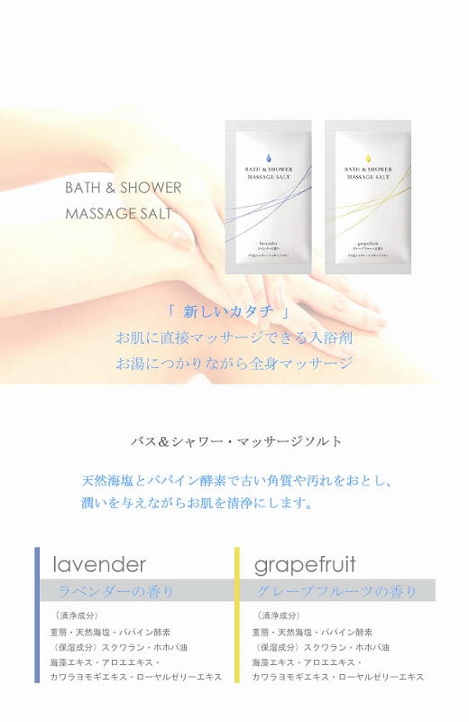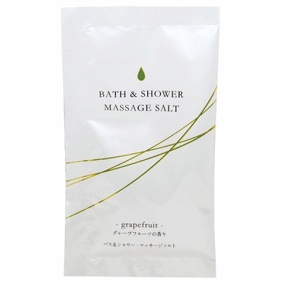 シャワーだけでもOK!直接マッサージできる入浴剤が登場!お肌をなめらかにひきしめる全身美容マッサージソルト(1回分)。天然海塩とパパイン酵素が古い角質や汚れを落としお肌をひきしめます。さらに6種類の保湿成分を配合し、しっとりなめらかなお肌へと導きます。使用方法はお肌を濡らした後、全身にパックし軽くマッサージして十分に洗い流します。マッサージ後洗い流さずにそのままの入浴も可能!もちろん入浴剤としてもご使用頂けますので、お風呂に浸かりながらの全身マッサージも出来ちゃいます。爽やかなグレープフルーツの香りに包まれながら、素敵なバスタイムをお楽しみ下さい。※お肌をいためる原因になりますので、強くこすりつけないで下さい。頭皮のマッサージにもお使い頂けますが、目に入らないようご注意下さい。 |