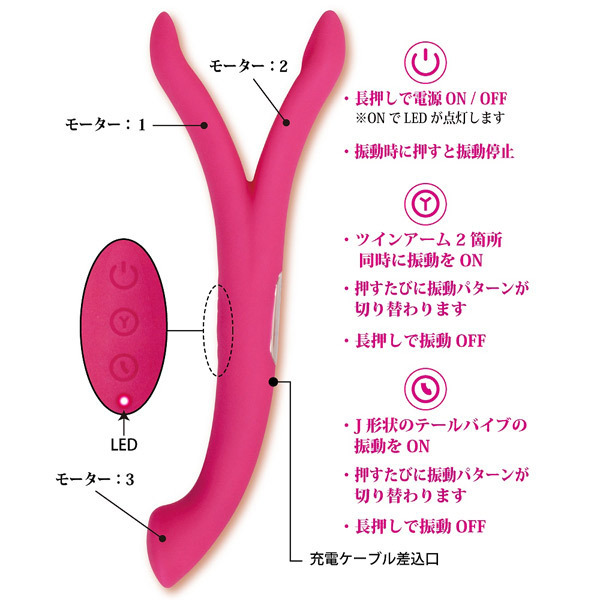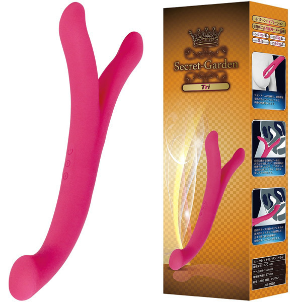 3分間以内のアクメ率なんと92%の瞬間絶頂!挟み込み&挿入どちらも楽しめるツインアームの双頭バイブ「シークレットガーデン トライ」。シリコン製のボディそれぞれの先端3ヶ所に、8パターン振動を備えた高性能モーターを搭載。二股のアームで乳首やクリをピンポイントで挟み込み!また、J型に絶妙なカーブを描く逆側のテールバイブはGスポットを確実に捉え、芯まで響くアクメ必至の強力刺激をもたらします。自在に曲がる柔軟なアームは片方だけを挿入して二ヶ所同時刺激や、二つのアームを同時に挿入したりとマルチに楽しめます。USB充電式(専用コード付属)。 |