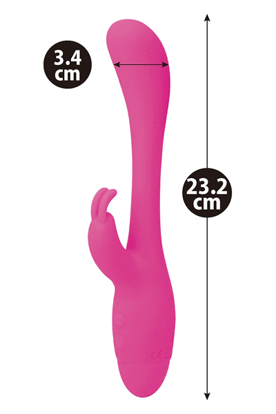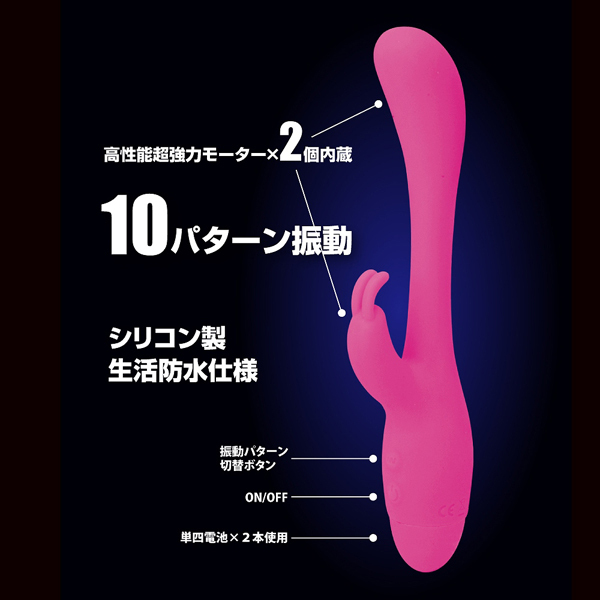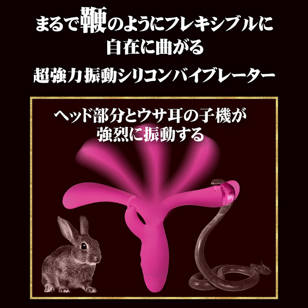 鞭のようにフレキシブルに曲がるという、これまでに余り類を見ない画期的な挿入シャフトを備えたGスポバイブです。先端部分とクリバイブに内蔵されている強力モーターが生み出すバイブレーションは圧巻!滑らかな肌触りのシリコン製ボディは挿入しやすく、先端はぷっくりと膨らんでいてGスポットを狙いやすく、クリバイブはうさぎの耳の形となっているためしっかりとクリを捉えてくれます♪挿入すると穴道に合わせて追随するフィット感バツグンの先端構造は思わず垂涎モノ!10パターンもの豊富な振動に動同期する挿入部とクリバイブは、どちらも生活防水仕様なので使用後のメンテンス性にも大変優れています。 |