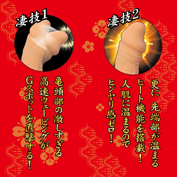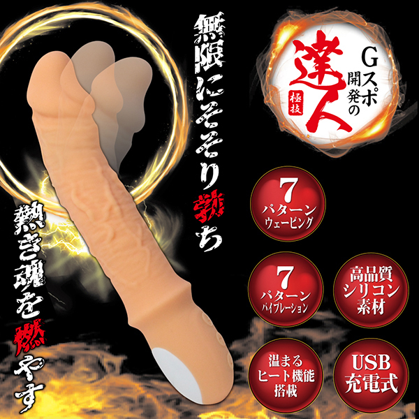 リアルタイプのディルドに特殊なアクションとバイブ機能とを搭載したトレートタイプのバイブレーター「Gスポ開発の達人」。亀頭部分の上下するウェービングアクションがGスポを的確に刺激!ノッキングするように刺激しながらGスポイキを誘発してくれます♪大きさ的にもミドルサイズでちょうどよく、色味やフォルムなどの見た目がリアルディルドっぽいので亀頭や余り皮、血管といったギミックとも相まって、視覚的にも興奮を掻き立ててくれます。無限にそそり勃つような上下の7パターンの動きが心地よく、Gスポを狙えばノッキングするような刺激が、同時に7パターンのバイブ機能がお楽しみいただけます♪電源はUSB充電式電池切れの心配も不要!高品質シリコン素材で先端付近にはヒート機能も搭載されているので人肌な温もりとリアルな挿入感がお楽しみいただけます。 |
