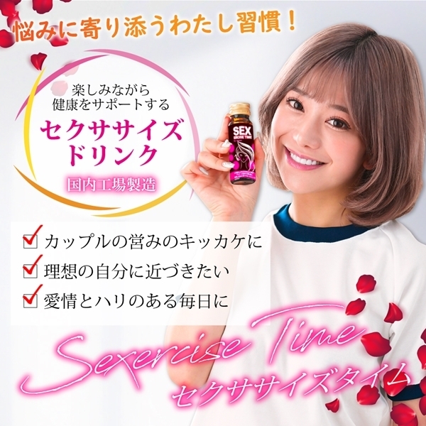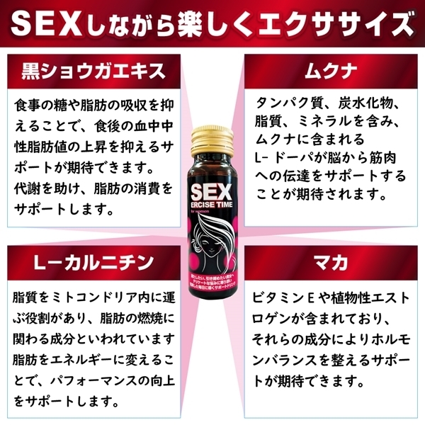 心身ともに自分を高めたい貴女のためのサポートドリンクです♪業界初の「セクササイズ」を実現しました!黒ショウガエキス末、マカエキス末、ムクナエキス末、L−カルニチンフマル酸塩の4つの厳選成分を配合しています♪毎日にメリハリをつけたい方にぴったりのドリンクです!悩みに向き合いたい方、理想の自分に近づきたい方にもおすすめ♪SEXERCISE TIMEは、身も心もスッキリとした充実した日々を目指し、愛情とハリのある毎日へと導きます。【お召上がり方】1日1本を目安に、よく振ってお召し上がりください♪【ご注意】原材料が沈殿を生じたり、時間の経過によって液色が変化する場合がありますが、品質には問題ありません。