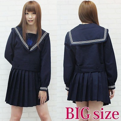 胸元の青い刺繍はお嬢様の証!大きいセーラー襟が清楚な冬服タイプの制服コスプレセット(BIG)。清潔感ある白い3本ラインが入った濃紺の長袖セーラー服は、サイドファスナー仕様。プリーツスカートはアジャスターで調節可能です。ベルト風にウエストをマークするデザインは、レトロで伝統ある学校の風合いを醸し出します。タイやスカーフがなくてもここまで可愛く仕上がった、大きめサイズのセーラー服コスチュームです!※水洗い不可、塩素系漂白剤による漂白不可、アイロンは中温で当て布使用、ドライクリーニング可、色落ちの可能性があります。※こちらの商品は在庫の状況によりお届けまでに4日〜7日程度かかる場合がございます。 |