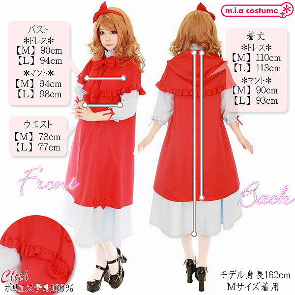 ハロウィン仮装や文化祭用の衣装にも最適♪名作童話の主人公になりきれる!ロングドレスでクラシカルにまとめたロリータ風赤ずきんコスプレ。フリルやリボンをあしらった真っ赤なマントに、ハイネックの白ロングワンピを合わせることで上品かつ可愛くデザイン!袖口に小さなリボンを飾っているところにも、こだわりを感じる一着です。カチューシャ付※塩素系漂白剤による漂白不可、洗濯の際はリボンなどの付属品を外し個々単独での手洗いをお願いします、色落ちの可能性があります。※こちらの商品は在庫の状況によりお届けまでに4日〜7日程度かかる場合がございます。 |