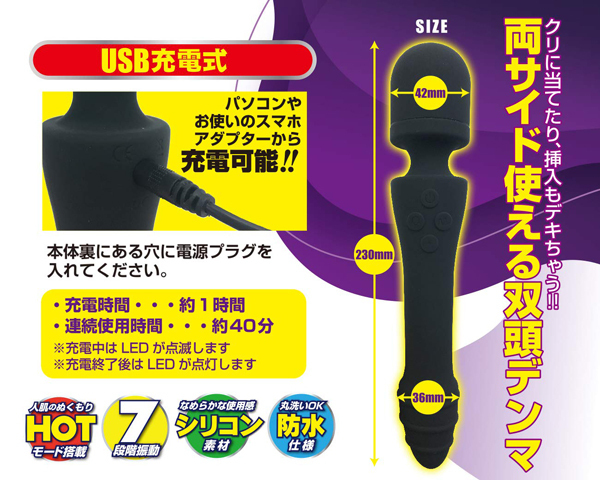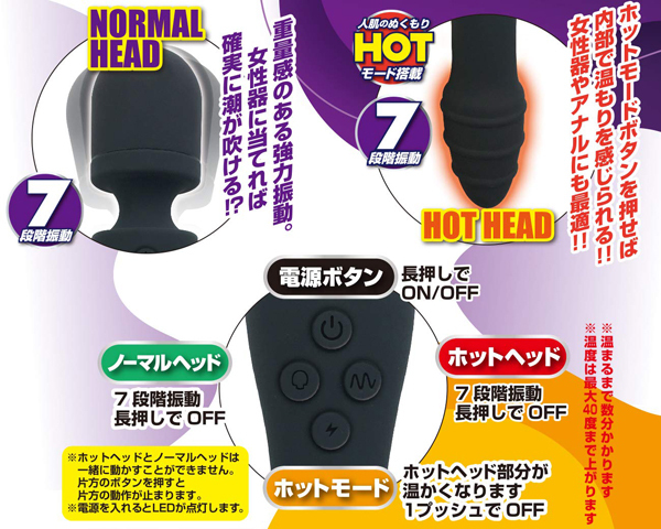 仕様:パッケージ:29.0×8.0×5.0cm 本体:23cm・ノーマルヘッド直径4.2cm・ホットヘッド直径3.6cm USB充電式