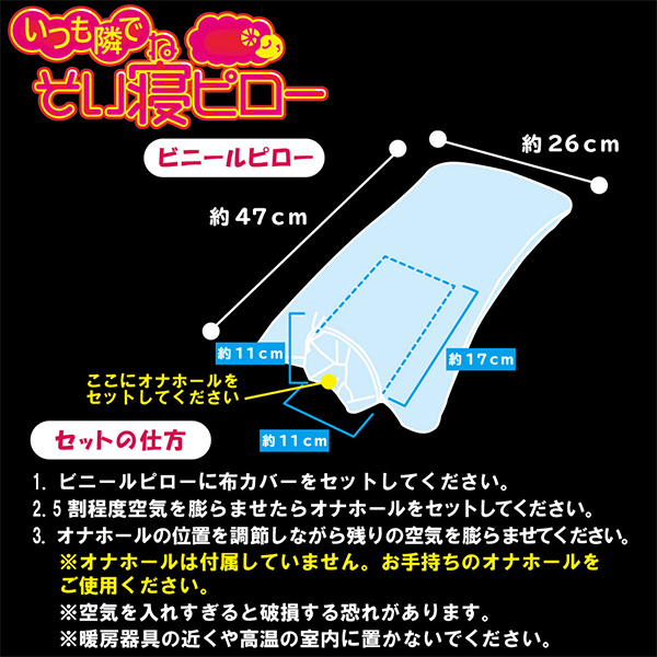 ふりふり腰振り!和服姿に半裸がエッチな「いつも隣でそい寝ピロー 大和なでしこな彼女ばーじょん」。ちょっぴり赤らんだ頬が可愛らしい大和なでしこな彼女との添い寝ができる、人気の添い寝ピローシリーズの新作です♪イラスト入りの専用布カバーとホールポケット付きのピローがセット!ちょうどいい大きさの専用布カバーの穴にお気に入りのホールをセットすれば大興奮がさらにテンションMAX♪表面は正常位、裏面は後輩位とそれぞれ違った体位が楽しめ腰フリオナニーが楽しめる!ホールポケットはミドルサイズでピローサイズは平均的な枕の大きさ。小さめのオナホの場合はタオルなどを巻いて調整してお使いいただけます♪ホールをセットする際は5割程度膨らませた状態で位置などを調整しながら空気を注入してください。※こちらの商品にオナホールは付属していません。別途、お買い求めの上ご使用下さい。 |