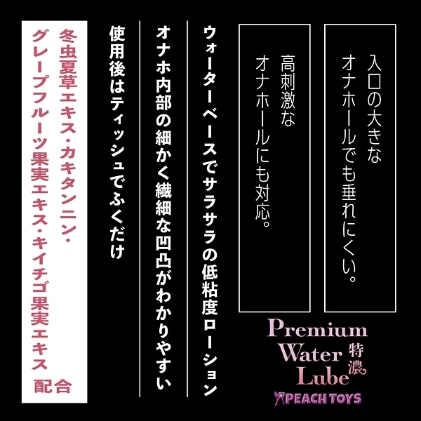 『水のように滑らか、でもヌルヌル感持続!ふき取るだけでOK!』「ふくだけローションPremium Water Lube (180ml)」が、ラベルデザインと容量・成分をリニューアルして再登場です!白いポンプの「ふくだけPWL 特濃」は、【低粘度+濃厚な液体】入口の大きなオナホールでも垂れにくい。高刺激なオナホールにも対応。冬虫夏草エキス・カキタンニン・グレープフルーツ果実エキス・キイチゴ果実エキス配合●ウォーターベースでサラサラの超低粘度ローション●オナホ内部の細かく繊細な凹凸がわかりやすい●使用後はティッシュでふくだけ簡単●無香料●安心の日本製●200ml 特濃 <成分>水、プロパンジオール、ヒドロキシエチルセルロース、乳酸、キサンタンガム、ローヤルゼリーエキス、アルギニン、マカエキス、水溶性コラーゲン、グリチルリチン酸2K、ローズマリーエキス、モモ葉エキス、カキタンニン、銀、フユムシナツクサタケエキス、クエン酸、クエン酸Na、BG、エタノール、セルロースガム、炭酸水素Na、フェノキシエタノール、EDTA-2Na、ブチルカルバミン酸ヨウ化プロピニル |