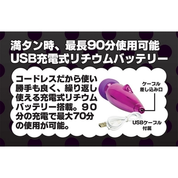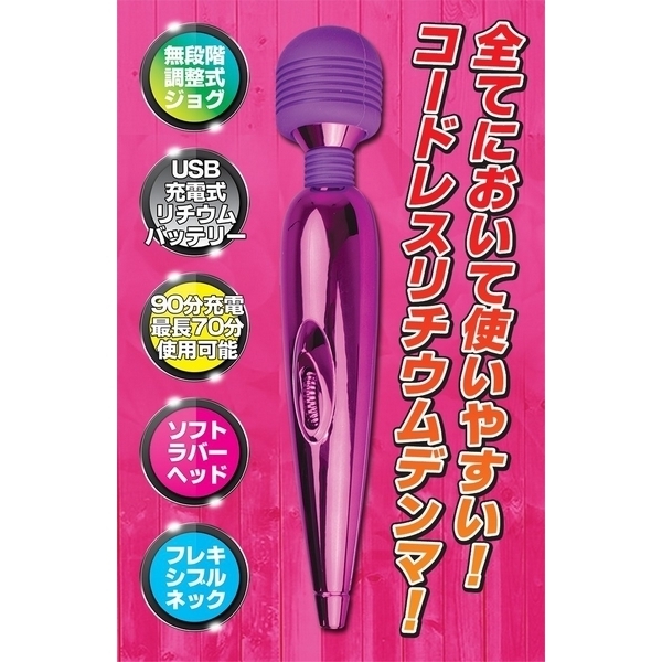 大定番の電マ、遂に極まる…!ハイパワーモーターのUSB充電式ハンディデンマ。●メタリックなパープルボディ●片手でも楽々ハンディサイズ●コードレスで使い勝手も抜群●15000回転の高性能モーター●優しいソフト製ラバーヘッド●柔軟なフレキシブルネック●無段階調整式ジョグダイヤル●充電90分で最大70分使用可。全てにおいて極まった最強デンマが登場!ハイパワーなリチウムバッテリーが実現した驚きの振動力を持つハンディ電マ。片手で持ちやすいサイズ感とコードレスならではの取り回しの良さ、そして電池式よりも優れた軽さも魅力です。 |