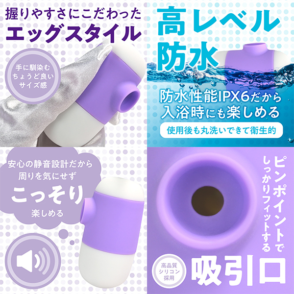手にフィットするエッグスタイルの吸引ローターです♪可愛いタマゴ型デザインに、高性能な静音モーターを搭載!上部に配置されたボタンで、操作もスムーズに行えます♪吸引口には柔らかく高品質なシリコン素材を使用し、ピンポイントで心地よくフィット!7パターンの吸引アクションを搭載しており、強弱の調整も自在に楽しめます♪120分の充電で、最大約90分の連続使用が可能!(使用状況により変動します!)IPX7相当の高い防水性能を備え、水洗いもできて清潔に保つことができます♪可愛さと機能性を兼ね備えた、使いやすさ抜群のアイテムです! |