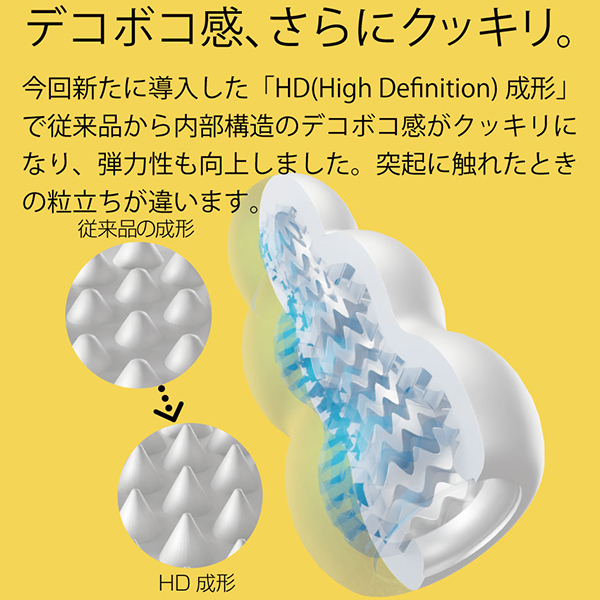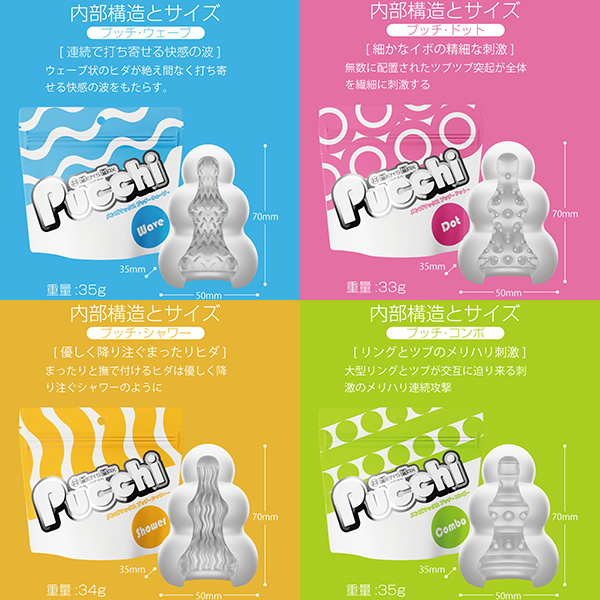 全てが新しくなったプッチ。ポケットサイズのローション不要ホールプッチシリーズが生まれ変わって新登場。軟性素材から内部の構造、パッケージ、全てが新しくなりました。デコボコ感、さらにクッキリ。今回新たに導入した「HD(High Definition)成形」で突起のデコボコ感がさらにクッキリになりました。突起に触れたときの粒立ちが違います。弾力感、さらにモッチリ。「HD 成形」により軟性樹脂の弾力性も向上。さらにモッチモチに、しなやかな素材になりました。内部構造も、さらにハッキリ。オリジナルシリーズ、スイーツシリーズ計8種類の内部構造をより精密な造形にリニューアル。「HD 成形」とあいまってデコボコ感がよりハッキリわかる構造になりました。生産工場を一新。新型プッチシリーズは日本国内に新設した工場から生産。最新の設備と厳密な品質管理で一つ一つ丁寧に作ります。ローション不要、必要なのは水だけ。ローション不要軟性素材「プラスウェッチ」水分が付着すると潤い成分が反応、ねっとりした潤いに包まれます。<ウェーブ内部構造>「連続で打ち寄せる快感の波」ウェーブ状のヒダが絶え間なく打ち寄せる快感の波をもたらす<ドット内部構造>「細かなイボの精細な刺激」無数に配置されたツブツブ突起が全体を繊細に刺激する<シャワー内部構造>「優しく降り注ぐまったりヒダ」まったりと撫で付けるヒダは優しく降り注ぐシャワーのように<コンボ内部構造>「リングとツブのメリハリ刺激」大型リングとツブが交互に迫り来る刺激のメリハリ連続攻撃 |