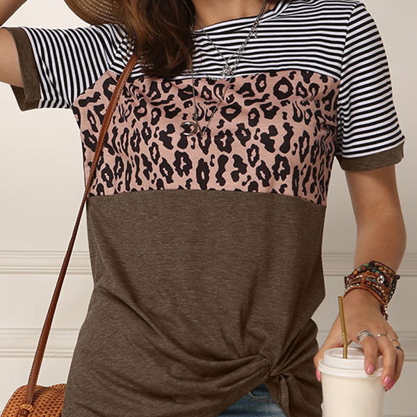 胸元でヒョウ柄に切り替えたブラウンカラーの半袖Tシャツ。ボーダーとヒョウ、無地の3種類を組み合わせた個性が光る一枚!お洒落着としても近所へのお出かけ用としても使えます。別色でピンクもご用意しております◎Mサイズ※裾は結んであるように縫い付けてあります。※商品写真はできる限り実物の色に近づけるよう加工しておりますが、お客様のお使いのモニター設定、お部屋の照明等により実際の商品と色味が異なる場合がございます。※個人測定の為、サイズに多少のズレがある場合が御座います、糸の縫いがあまかったりほつれがある場合がございますので、理解の上で購入してください。