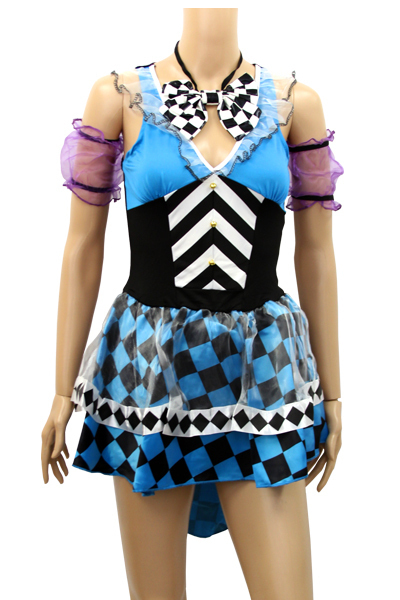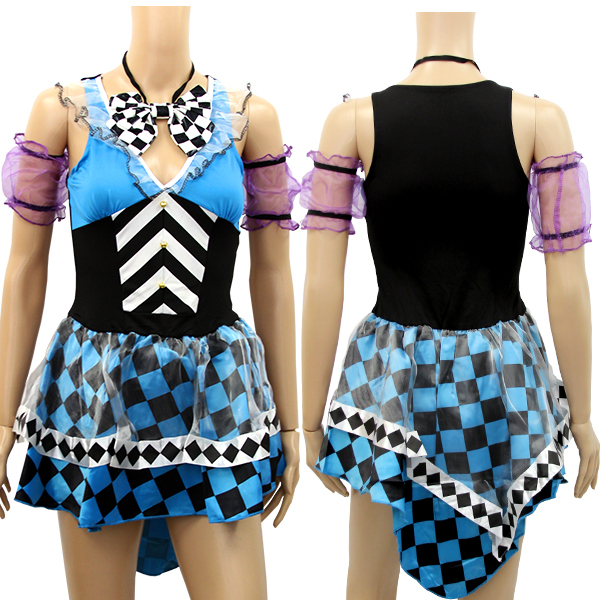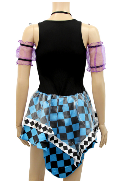 ふしぎの国でティーパーティー♪カラフルポップなマッドハッター風のコスプレ衣装。ブルーをベースに紫×黒とハーリキンチェック柄を随所にちりばめたオシャレでポップなミニドレス。ハーリキンチェック柄で軽やかなスカートをお探しの方にもぴったり♪ドレスは柔らかな素材を使用したノースリーブのワンピースタイプ!後ろ丈が長いハイロウタイプのスカートは、シースルーのオーガンジー生地を重ねたレイヤードデザイン。さらに、マッドハッターの特徴でもある「10/6」ミニハットと首リボン、シースルーのアームバンドもセット!絶妙な色使いで魅せる女性版マッドハッター風のハロウィンコスチュームです。スカート部分にもハーリキンチェック柄で拘りたい方や、流行り廃りの無いシンプルなデザインで楽しめるかわいいタイプのチェック柄に目がない方にもお勧めです♪。※セット内容以外は付属しておりません。 |