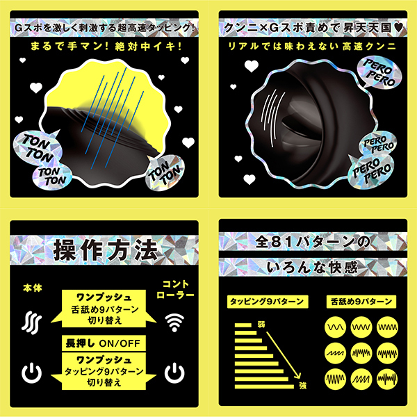 Gスポ覚醒!高速タッピング!超!愛を感じる舐め×手マンバイブ!トントンとGスポを刺激する高速タッピング機能はまるで手マンされているかのような極上快感!スベスベの舌で舐め上げるクンニはリアルでは味わえない超高速舌技!クンニ×Gスポ責めでたまらない快感_遠隔操作コントローラー付きなので、手放しでも楽しめます!中イキ開発にもオススメです_敏感な部分に直接触れるものだから、ぷにっとソフトな素材を使用しました。タッピング9パターン&舌舐め9パターン。完全防水IPX7等級&充電用USBケーブル付属&遠隔操作コントローラー付き●カラー:black |