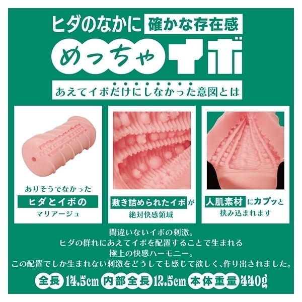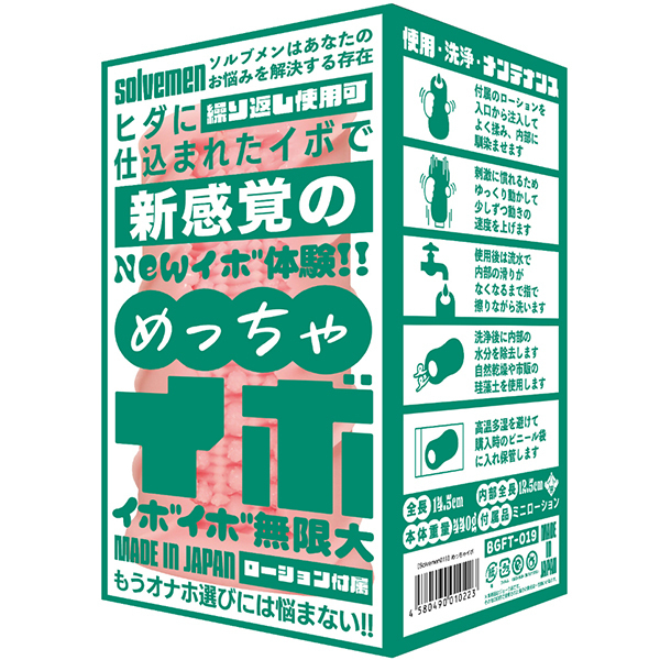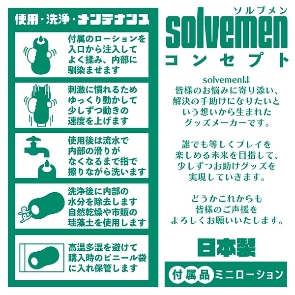 ソルブメンはあなたのお悩みを解決する存在です。「今日はイボで刺激的に」「今日はヒダでやさしく」同じものを使い続けたいときもあれば、1日おきに違うものを使いたいときもある。そんな気まぐれに全力で応えたいです。それがソルブメンの生まれた意味だと思いませんか?今回のテーマは「めっちゃイボ」となります。敢えてイボだけにしなかった意図をお教えしましょう。ヒダのなかに確かな存在感、イボは本当にイボ。それは間違いないのです。しかし敢えてヒダの群れにイボを配置する事でしか生まれない、極上の快感ハーモニーがあることをどうしても感じて欲しかったのです。あなたはオナホ選びに悩む必要はなくなります。あなたのためにソルブメンがいるのです。安心安全の日本製で繰り返し何度でも利用が可能です。 |