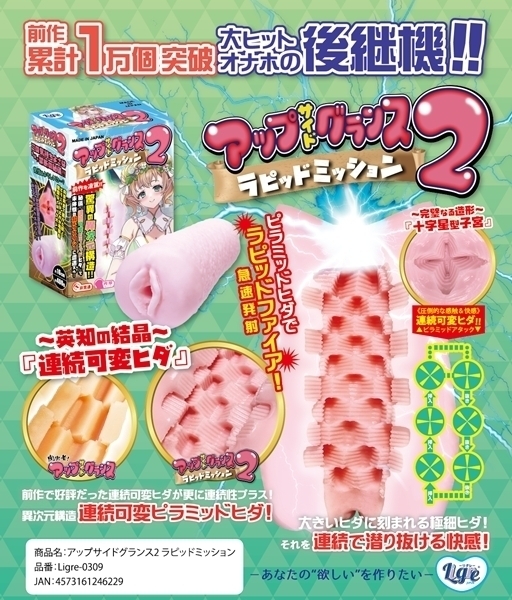 大ヒット商品「アップサイドグランス」の進化版として登場しました♪内部には1cm単位で変化する独自のヒダ構造を採用し、新たな使用感を実現!大きなヒダの中に繊細な極細ヒダを重ねることで、連続する変化に富んだ刺激を体感できます♪非貫通タイプでしっかりとした密着感があり、圧迫と包み込みを同時に楽しめます!素材はエラストマー製で、やや柔らかめの弾力が心地よくフィット♪本体は手に収まりやすいサイズ感で、操作性にも優れています!付属のローションを使用すれば、よりスムーズな挿入が可能♪シリーズの特徴である可変ヒダ構造をさらに進化させ、より立体的な刺激を追求しました!長時間の使用でも飽きのこない設計で、繰り返し楽しみたくなる仕様です♪進化した構造で、新しい刺激を求める方におすすめの一本です! |