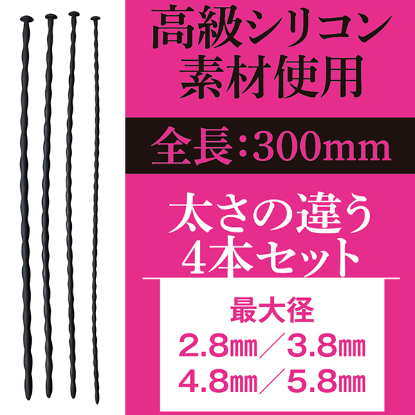 あなたの尿道を覚醒させるシリコン製の「極細シリコンプラグ」!それぞれ太さの違うシリコンカテーテルの4本セット♪長さが十分あるので本格的なサウンディングプレイをお楽しみいただけます!4サイズともにそれぞれ径が違いますが、ビギナーからでも始められそうなサイズ感となっております♪先端部分は先細で挿入しやすく、表面にはデコボコ加工が施され、底部はストッパーになっているので安心感もあります。※サウンディングプレイは衛生面に注意し、しっかりと減菌や消毒を行ってからプレイしましょう。●メーカー型番:TMT-1579 |