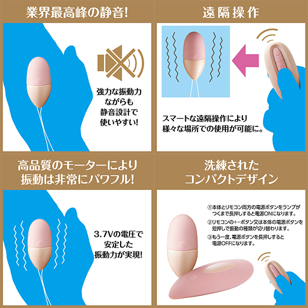 YUIRA人気ブランド極天シリーズからワイヤレスローター登場。〜シンプルで落ち着きのあるスタンダードボディ〜スタンダードな卵型。使用用途は様々。リモコンコントロールで、一人でもゆっくり、敏感なポイントにアプローチ出来ます。ラグジュアリーな見た目で、初めての方にもでも受け入れやすいアイテムになっています。◎遠隔操作→スマートな遠隔操作により様々な場所での使用が可能に。◎業界最高峰の静音→強力な振動ながらも静音設計で使いやすい。◎高品質のモータにより振動は非常にパワフル!→3.7Vの電圧で安定した振動力が実現。◎10種の振動パターン→ボタン式でスムーズに調整可能です。◎シリコン素材→可動部シリコン素材採用でデリケートゾーンへの使用も安心。