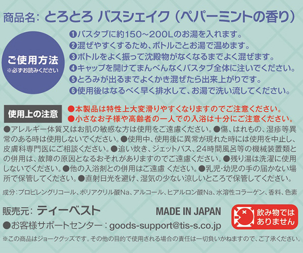 トップページ > ソープグッズ > 入浴剤(ローション風呂) > とろとろ バスシェイク (ペパーミントの香り)