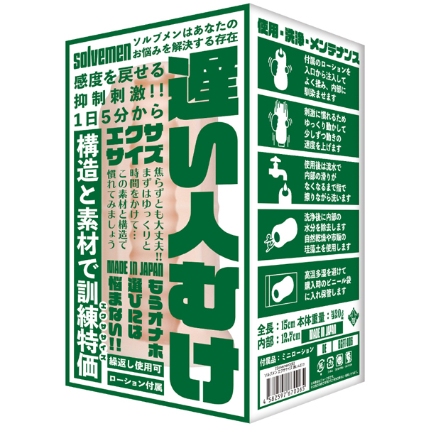 ソルブメンはあなたのお悩みを解決する存在です。「遅い人向けエクササイズ」は常日頃から自分の遅さに悩む方に向けた提案型お悩み解決ホール。普通のホールでは注目されにくく専用グッズが開発されにくい分野ですが、ソルブメンのエクササイズホールなら毎日楽しみながら新しい自分へと前進する事ができるでしょう。遠い昔の感度に再会できる喜びを知ったらもう普通のホールには戻れません。あなたはオナホ選びに悩む必要はなくなります。あなたのためにソルブメンがいるのです。安心安全の日本製で繰り返し何度でも利用が可能です。週に3〜4回はエクササイズにチャレンジしてくださいね! |