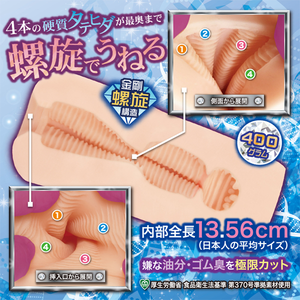 螺旋でせんずり、それがラセンズリー!ダイヤモンドラセンズリーは、4本の硬質タテヒダが「螺旋でうねる」高刺激スパイラルオナホールです。螺旋でうねる硬質タテヒダの正体は「3mm間隔ヨコヒダ」の集合体。この仕様により「タテでの螺旋の刺激」と「ヨコヒダのまとわりつく刺激」が挿入口から連なり「複雑なうねり刺激」が発生。最奥に配置された「突イボ」スポットへの到達で緩急ある快感となり、深みのある使用感のオナホールとなっています。ボディは「螺旋の刺激をMAX」で伝えるために「オクタゴン(八角形)造形」を採用。8つのエッジが内部の4本の硬質タテヒダをピンポイントで押しつけ、螺旋の快感を逃しません。全長150mmのミドルタイプですので、ストロークの時に「先端がしな垂れる」ことなく、真っ直ぐなフォルムをキープ。ストレートな螺旋の刺激を余すことなくお楽しみいただけます。保管に便利な専用ブリスターケース、オリジナルローション付属。非貫通のオナホール |