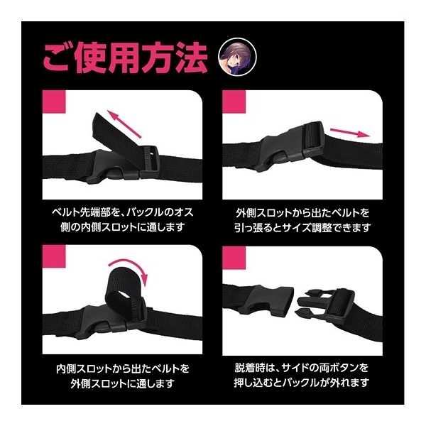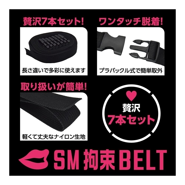 好きなあの子をいいなりに……。これひとつでSMプレイの拘束を簡単にする、ボンデージ用ベルト7本セット「SM拘束BELT」!SMプレイの核心となる「拘束」を、とってもお手軽にするSMアイテムです。ワンタッチで装脱着できる、バックル式のナイロンベルトです。クルッと巻いてカチッと装着、アジャスターからベルトを引っ張ってサイズ調整すれば、しっかり適切の拘束緊縛。ベルトはナイロン素材で強度もばっちりの頑丈仕様。バックルはサイドリリースバックルの差し込むだけで装着&サイドボタン押すだけで脱着の簡単仕様。アジャスターでサイズ調整できますので場所を問わずにぴったりフィットします。長さ違いの7本セットですので、様々な場所を拘束出来ます。手枷、足枷、頭枷、胴枷、太腿枷、と多彩な拘束バリエーションとなります。さらに、家具に縛り付けたり、おもちゃを固定したりなどの使い方もOK!クルッ&カチッと巻くだけで簡単に拘束プレイを楽しめます!●カラー:ブラック |