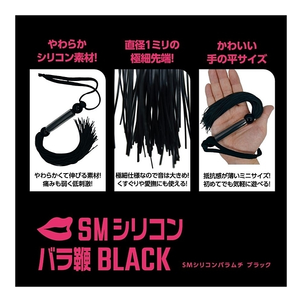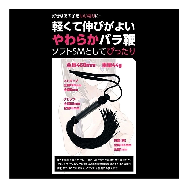 好きなあの子をいいなりに…。SMプレイの代名詞、SM専用バラ鞭「SMシリコンバラ鞭」!ビシッバシッと叩く音が響き渡る、SMプレイでは欠かせない「鞭責め」をお手軽に始められるSMアイテムです。細さ1ミリの柔らかいシリコン素材を束ねた鞭ですので、重さも軽く、初心者の方でも簡単に取り回しできます!柔らかさがクッションとなり痛みになりづらくバラけた鞭先からは大きい音が鳴り鞭責めの興奮を強く煽るはず。シリコン特有のサラリとした肌触りなので不快感もありません。全長260ミリ(ストラップ含まず)とやや小ぶりサイズなので、軽い気持ちで手に取れまず。遊びのつもりでビシバシしていると、いつの間にか鞭責めの魅力に惹かれてしまうかも!●カラー:ブラック |