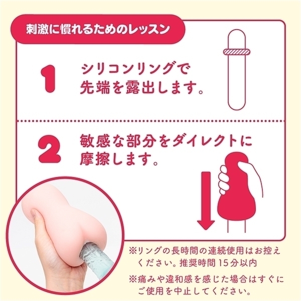 『早くイッちゃダメ!』刺激ほぼゼロ!超絶まったり系!やわらか、とろ〜り生オナホ!あなたの先端をちゅるんと飲み込むプリプリポルチオ搭載!とぅるんとぅるん快感のチュポチュポとろけるレッスン!付属のシリコンリングで敏感部分を露出し先端強化!ぷにっとソフトなリングで優しい締め付けを可能にしています。大中小の3種類でいろんなサイズにぴったりフィットします。敏感部分をふんわりとろける生感触で低刺激。レッスンしながら楽しめる一石二鳥のホールです。直接肌に触れるものだから安心の国産素材&国内生産。パッケージイラスト:平つくね |