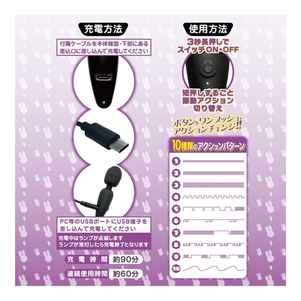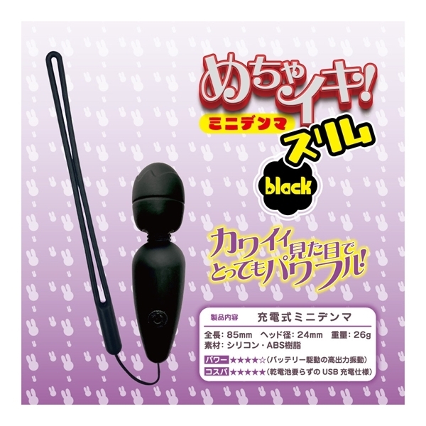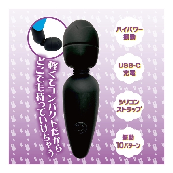 カワイイ見た目でとってもパワフル!USB-C対応の充電式ミニ電マが新登場!全長85ミリの小さくて可愛いミニサイズの電マです。小さなボディに、高出力の充電バッテリーとハイパワーな振動モーターを内蔵しました。アクションパターンは10種類もありますので、お好みの振動を見付けましょう!さらに、充電方法に最新となるUSB-C方式対応。お使いのスマホ充電環境で、そのままで充電できます。乾電池要らずなのでコスパも抜群。不意な落下を防ぐ、オシャレなシリコン製ストラップ付き。スベスベで肌ざわりの良い、ヘッド部シリコン素材。軽いからどこでも持っていける、重さ26グラム。自由に曲がる、フレキシブルネック。充電時間約90分で、連続稼働約60分。「スリム」は、スッキリとした細身が特徴的なスマートデザイン。ヘッド直径26ミリ!初めての方でも大満足の、チャーミングでラブリーなミニ電マ!●ブラック |