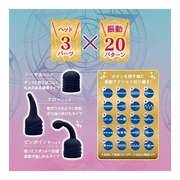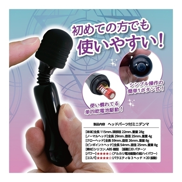 ヘッドパーツの付け替えで、プレイ感覚が変わる!3種のヘッドパーツがセットになった、小さくて可愛いミニ電マが新登場!付け替えできるのは、アタッチメントのヘッドパーツ。スタンダードな丸みのあるノーマルヘッド、爪のように伸びたクローヘッド、狙ったスポットへ的確直撃が楽しめるピンポイントヘッド、とがセットになりました。付け替えることで異なる快感を楽しめます。さらに、この快感を煽る振動アクションはなんと20パターン!バリエーションに富んだアクションは、きっとお好みが見付かるはず。3ヘッド×20振動で、新しい快感へと飛び出しましょう!ヘッドパーツの素材は、肌ざわりの良いシリコン製。どこにでも持っていける、重さ50グラム。使い慣れてる&強力な、アルカリ乾電池式。自由に曲がる、フレキシブルネック。分かりやすい、シンプル操作のワンボタン式。初めての方でも大満足、快感キュンが止まらないミニ電マ!●カラー:ブラック |